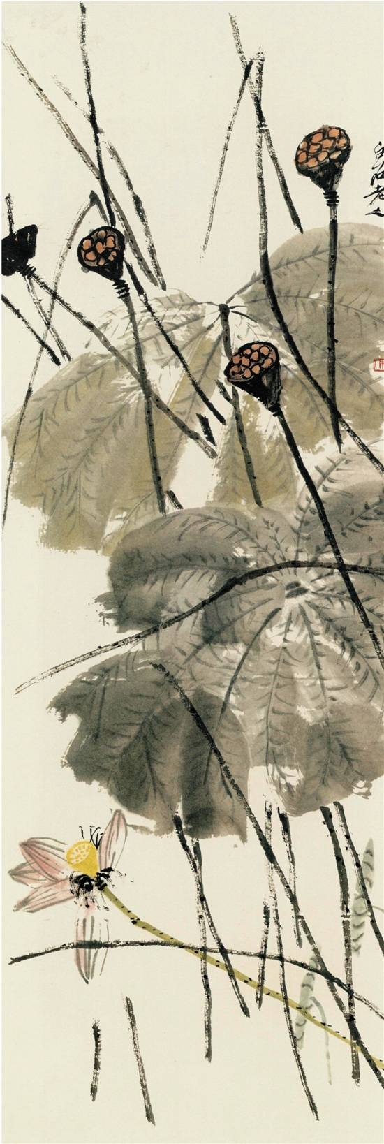 中国画家爱画荷花,远的有明末清初的八大山人和恽寿平,近代的中国画大师吴昌硕、齐白石、张大千、潘天寿、刘海粟、李苦禅、石鲁等,都是画荷花的妙手。八大山人的荷花残败荒凉,恽寿平的荷花工笔规整,吴昌硕的荷花金石味浓,齐白石的荷花豪放大气,张大千的荷花婀娜多姿,潘天寿的荷花刚健挺拔,刘海粟的荷花泼彩浓艳,李苦禅的荷花铁笔酣畅,石鲁的荷花夸张简练,每个人都对荷花有自己的刻画和解释。但若论最奔放写意,淋漓痛快,则非齐白石的荷花莫属。齐白石画的荷花也是经历了一个由简到繁的过程,晚年的荷花墨色淋漓,色彩艳丽,穿插繁密,笔势豪放,将荷花的写意描绘推高到一个新的境界。